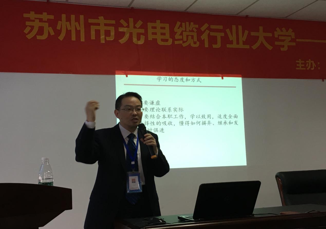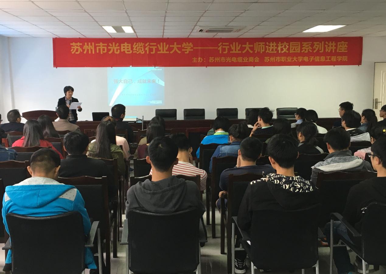 Iccsz訊 10月12日,由蘇州市光電纜業(yè)商會、蘇州市職業(yè)大學電子信息工程學院主辦的“蘇州市光電纜行業(yè)大學--行業(yè)大師進校園系列講座”拉開序幕,在電子信息工程學院知信樓舉辦了首場專家大師講座。特邀蘇州市光電纜業(yè)商會專家委員會副主任、亨通集團國家級企業(yè)技術(shù)中心副主任王永忠,給學院的應(yīng)用電子技術(shù)、微電子技術(shù)、電子信息工程技術(shù)等專業(yè)2017屆畢業(yè)生以及相關(guān)專業(yè)教職員工,作了題為《強大自己,成就未來!》的講座。