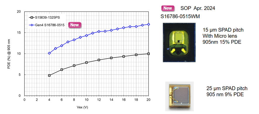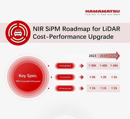濱松持續(xù)升級NIR SiPM的性能,推動905 nm和940 nm激光雷達以更低的成本達到1550 nm激光雷達測距效果,300 m@10%反射率。