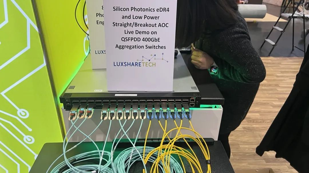 展會(huì)期間,由立訊技術(shù)(Luxshare-Tech)與某全球知名ICT科技集團(tuán)聯(lián)合研發(fā)的低功耗互連解決方案正式亮相。該方案基于400G以太網(wǎng)交換機(jī)平臺(tái),涵蓋硅光子QSFP-DD DR4光收發(fā)器、QSFP-DD To QSFP-DD AOC、QSFP-DD To 2xQSFP56 Breakout AOC和QSFP-DD To 4xQSFP28 Breakout AOC等產(chǎn)品。