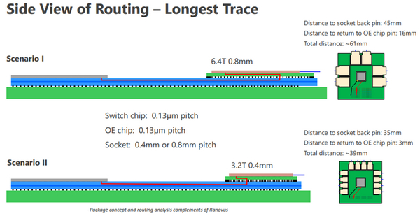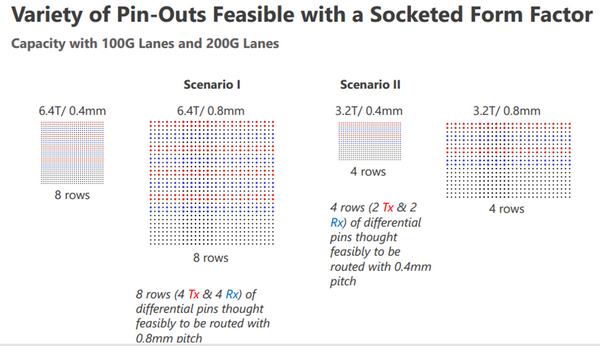 針對光電轉(zhuǎn)換模塊兩種尺寸的管腳間距,其與基板上核心Die之間的高速信號鏈路長度也會不同。根據(jù)初步的估計,采用0.4mm管腳間距的小尺寸光電轉(zhuǎn)換模塊在芯片基板上的走線長度會更短一些。對于112Gbps和224Gbps信號速率,更短的傳輸距離不僅意味著更高的信號質(zhì)量,也意味著更低的能耗。因此,業(yè)界目前更傾向于在光電共封裝的高密度交換芯片里使用小尺寸的光電轉(zhuǎn)換模塊。對于一些密度不是太高的網(wǎng)絡(luò)或計算類芯片,在芯片基板上使用大尺寸的光電轉(zhuǎn)換模塊也是可行的。