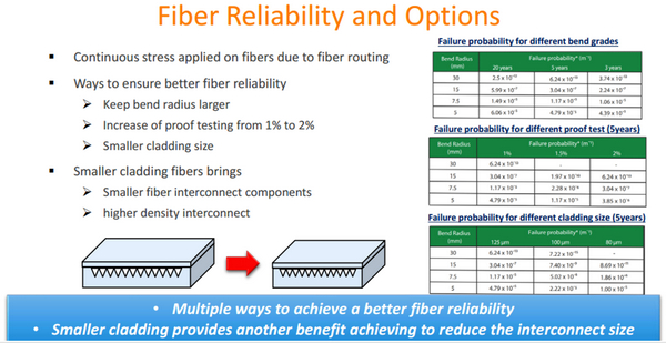 任何一種先進技術(shù),一旦進入到工程實踐,就必須要考慮可靠性和可維護性的問題,光電共封裝的芯片設(shè)計技術(shù)也不例外。由于這類芯片會用到大量的光纖進行信號連接,而光纖的彎曲半徑、覆蓋膜厚度等因素都會影響到光纖的失效率,所以選擇哪種類型的光纖、如何取得更高的生產(chǎn)加工良率,都將會是芯片設(shè)計者、系統(tǒng)設(shè)計者需要仔細考慮的問題。