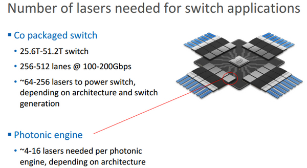 除了光纖的選擇之外,在光電共封裝芯片的光電轉(zhuǎn)換模塊里還存在大量的激光器。按照目前的估計,每一個小的光電轉(zhuǎn)換模塊(光引擎)里會有4~16個激光器。這樣一來,在光電共封裝芯片里就存在一個較大的激光器陣列。