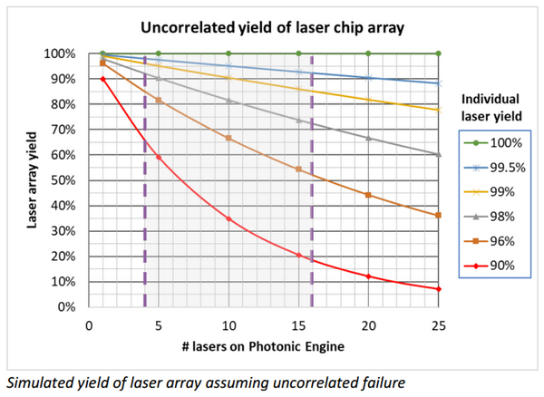 在將每個激光器的良率都看成是與其它激光器不相干的情況下,每個激光器良率的累積就將是整個光引擎的良率。按照理論計算,對于具有4個激光器的光引擎,只有每個激光器的良率達到98%,光引擎的良率才能超過90%。而如果在一個光引擎里有多達16個的激光器,則每個激光器的良率要達到99.5%,光引擎的良率才能超過90%。良率的這些限制對于整個硅光模塊生產(chǎn)加工的品質(zhì)控制提出了很高的要求。