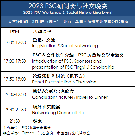 PSC中華光電學(xué)會從2008年開始舉辦技術(shù)交流活動。疫情期間的年度會議以虛擬會議和小型晚宴等方式舉行。今年,PSC將恢復(fù)完整的線下會議活動。PSC年度研討會廣泛邀請來自運營商、服務(wù)商和OEM企業(yè)備受尊敬的光學(xué)專家組成演講陣容,就廣泛的商業(yè)和技術(shù)相關(guān)的熱門話題進(jìn)行演講。