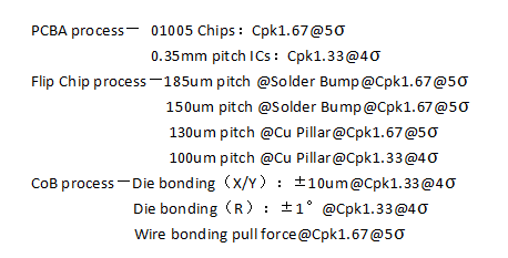 ---完整配備的周邊設(shè)備,包括:PCBA清洗機(jī)(Auto-water-cleaning/Auto-plasma-cleaning)、分板機(jī)(Routing/Laser)、點(diǎn)膠機(jī)(Globtop/Underfill/Conformal coating)、2D X-ray、3D X-ray(AXI)、ICT/Flying Probe/FCT測(cè)試、鐳雕機(jī)、BGA返修臺(tái)、Ball Drop植球機(jī)等