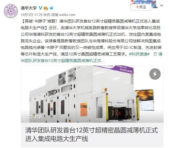ICC訊 據(jù)清華大學(xué)官方消息,近日,由清華大學(xué)機(jī)械系路新春教授帶領(lǐng)清華大學(xué)成果轉(zhuǎn)化項(xiàng)目公司華海清科研發(fā)的首臺(tái)12英寸(300mm)超精密晶圓減薄機(jī),已經(jīng)正式出貨,發(fā)往國(guó)內(nèi)某集成電路龍頭企業(yè)!