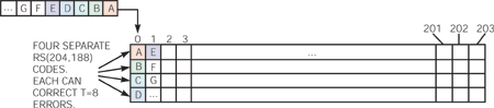 圖2 你可以將與一維RS(204,188) 代碼的4行交錯表示為一張表,表中有4行,每行204字節(jié)。