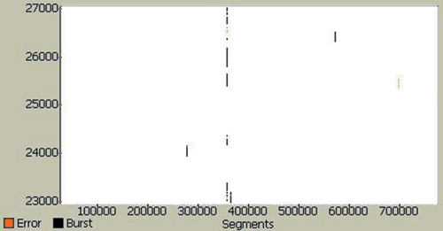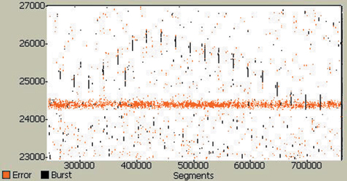 明誤碼突發(fā)是隨機而又相關的。圖3示出了該數(shù)字信道某一部分的誤碼圖。誤碼圖將數(shù)據(jù)分割成段,并且將各段一個挨一個放置以生成一個由誤碼信息組成的2維圖像。2維圖像突出顯示了檢測到的位差錯的位置。由位誤碼現(xiàn)象和突發(fā)現(xiàn)象造成的差錯標有不同的顏色,能使人更好了解誤碼原因。圖4表明:既有位差錯又有突發(fā)差錯,并且有些錯誤與段長度(水平"波段")是高度相關的,段長度等于系統(tǒng)"固有的"數(shù)據(jù)信息包大小。