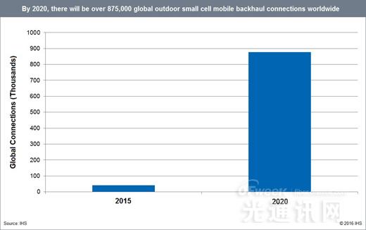 由于移動運營商需要加強飽和宏蜂窩網絡性能,通過在密集型低功耗節(jié)點部署增加容量改善移動寬帶體驗,IHS表示2020年室外小型基站回程市場將達到22億美元,五年(2016-2020)年均復合增長率(CAGR)將達到80%。