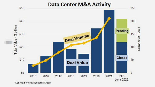 ICC訊(編譯:Nina)Synergy Research最新數(shù)據(jù)顯示,今年前六個(gè)月,全球已完成的以數(shù)據(jù)中心為導(dǎo)向的并購(gòu)交易達(dá)到87起,總價(jià)值為240億美元;另有180億美元的未決交易,其中大部分預(yù)計(jì)將在年底前完成。再加上幾乎沒有提前公布的常規(guī)交易流程,2022年數(shù)據(jù)中心并購(gòu)活動(dòng)將達(dá)到去年的創(chuàng)紀(jì)錄水平。據(jù)Synergy記錄,2021年完成的交易達(dá)到209筆,總價(jià)值超過480億美元,相比2020年的340億美元增長(zhǎng)了41%,創(chuàng)下了數(shù)據(jù)中心交易價(jià)值的新紀(jì)錄。