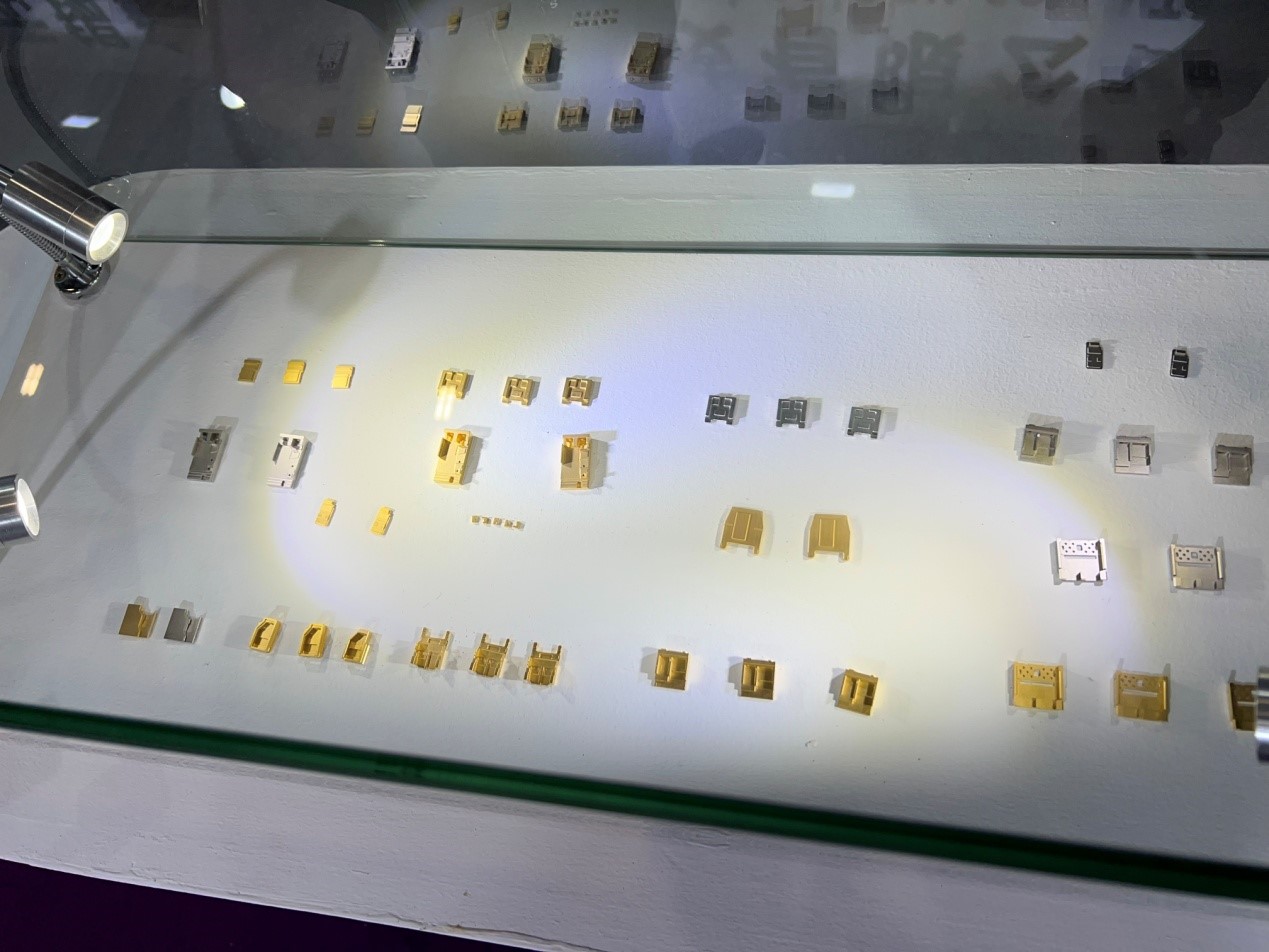 在車載光學(xué)領(lǐng)域鑫巨宏實(shí)現(xiàn)重大突破,光學(xué)組件拿到國(guó)內(nèi)頭部新勢(shì)力車企訂單數(shù)億元,并于明年大規(guī)模交付。在光通信應(yīng)用產(chǎn)品方面,無錫鑫巨宏可以提供一系列800G Lens Array、COB/COF光學(xué)透鏡、單模Lens和HDMI Lens Array等光學(xué)元件產(chǎn)品,可應(yīng)用于高速光模塊。同時(shí),光模塊可伐鎢銅光電底座和管殼是無錫鑫巨宏展示的另一個(gè)主力產(chǎn)品系列,該系列產(chǎn)品得益于公司420臺(tái)高速CNC加工中心,具備把金屬結(jié)構(gòu)件(BOX、熱沉類)從粉末冶金(MIM)到CNC加工以及電鍍的全制程垂直整合能力。