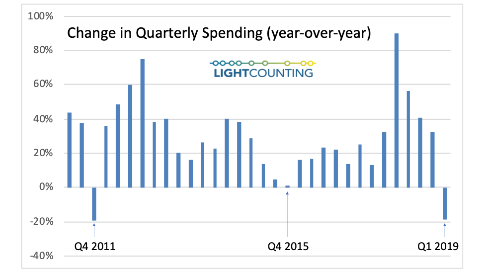 此前季度數(shù)據(jù)下降(Q411和Q415)主要是由于谷歌支出的波動(dòng)。減去谷歌支出影響,Q411Q415都能實(shí)現(xiàn)20-25%的增長。但是,Q119情況并非如此,盡管谷歌支出的下降影響整體支出的下降,但這種支出下降幅度很大,影響更廣泛。實(shí)際上,在前15位的計(jì)算公司中,有9家公司的支出下降,包括阿里巴巴、蘋果、微軟和騰訊。