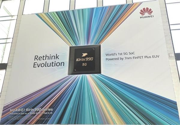 宣傳海報寫著“重構(gòu),進化(Rethink Evolution)”以及“世界首個5G SoC,采用7nm FinFET Plus EUV工藝”。左下角的小字則寫著“華為麒麟990系列,歡迎參觀6.2A大廳#101展位”。