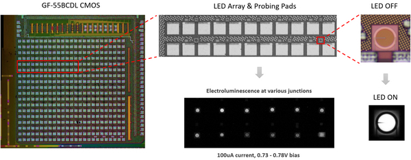 他們設(shè)計(jì)了一種微米級大小正向偏置全硅基 LED,在完全集成于 55 納米制程商用 CMOS 微電子芯片(無任何實(shí)驗(yàn)室處理)的基礎(chǔ)上實(shí)現(xiàn)了低電壓、高速高亮的近紅外發(fā)光,其發(fā)光強(qiáng)度和調(diào)制解調(diào)速度可同時(shí)達(dá)到此前類似器件實(shí)驗(yàn)室記錄的十倍以上。