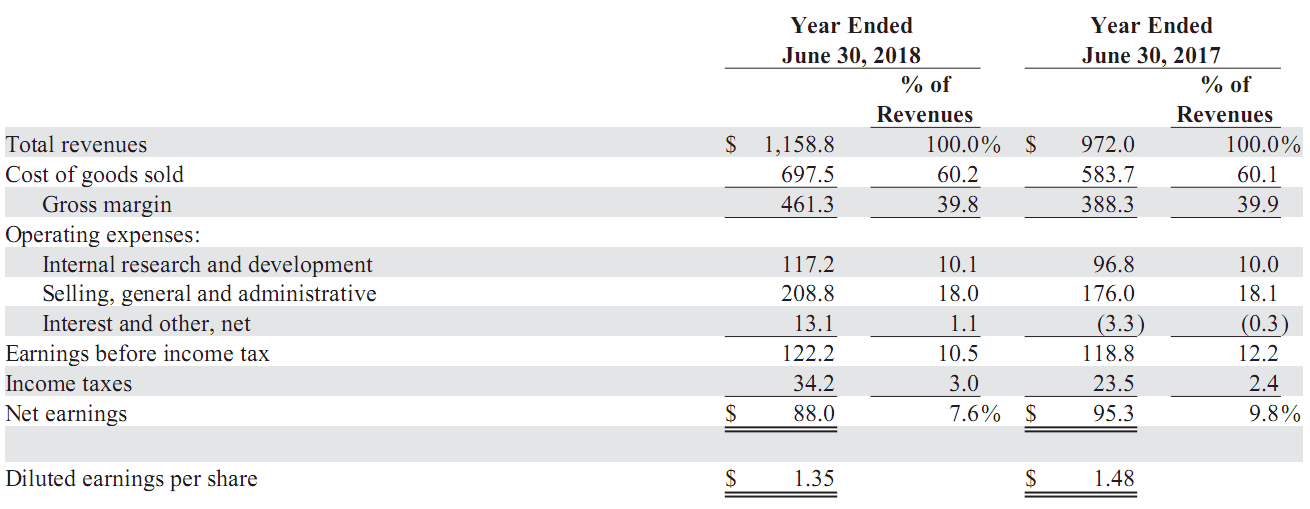 ICCSZ訊 工程材料及光電器件制造商美國(guó)II-VI公司2018財(cái)年(2017.7-2018.6)總營(yíng)收達(dá)11.59億美元,同比增長(zhǎng)14%,凈利潤(rùn)8800萬美元,凈利率為7.6%,毛利率為39.8%。