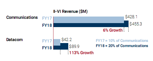 5、對(duì)數(shù)據(jù)通信的VCSEL、微光學(xué)和隔離器材料的制造能力投資:這些投資使II-VI能夠?qū)⒊笠?guī)模數(shù)據(jù)中心光收發(fā)器的數(shù)據(jù)通信產(chǎn)品銷售額翻番。 在2018財(cái)年,數(shù)據(jù)通信占通信收入的20%,高于去年的10%。