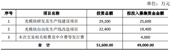 與此同時(shí),上市公司擬募集配套資金,總額將不超過(guò)4.9億元,募集配套資金擬用于蘇州旭創(chuàng)光模塊研發(fā)及生產(chǎn)線建設(shè)項(xiàng)目、光模塊自動(dòng)化生產(chǎn)線改造項(xiàng)目等,具體情況如下: