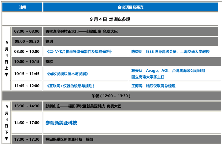 本屆研討會內(nèi)容豐富,并聚集了光通訊行業(yè)眾多重量級嘉賓。兩大培訓課程干貨多多,并邀請到上海交通大學教授陳益新老師,國立高雄應用科技大學電子工程系教授與系主任施天從博士為我們傳道授業(yè),陳益新教授的培訓課程是《Ⅲ-Ⅴ化合物半導體光噐件及集成光路》;施天從博士則在《光收發(fā)模塊技術(shù)與發(fā)展》方面與我們詳聊。
