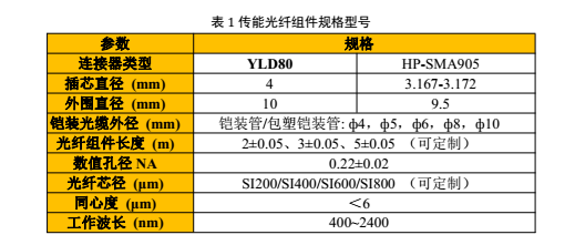 長(zhǎng)飛光纖光纜股份有限公司(以下簡(jiǎn)稱長(zhǎng)飛公司)基于市場(chǎng)應(yīng)用,開(kāi)發(fā)了系列傳能光纖組件?;疽?guī)格型號(hào)如表1。