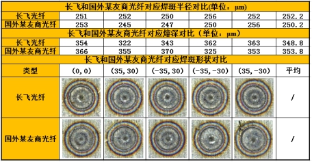 長(zhǎng)飛公司和國(guó)外某友商公司類結(jié)構(gòu)200μm纖芯傳能光纖組件在焊斑形狀及焊斑半徑兩個(gè)指標(biāo)上相近,在熔深指標(biāo)上,長(zhǎng)飛光纖略低于國(guó)外某友商光纖,但因這種差異較小,在實(shí)際使用中影響甚微。
