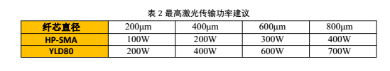 傳能光纖組件的主要部件是其中的傳能光纖及相應(yīng)的光纖連接器。長(zhǎng)飛公司作為技術(shù)領(lǐng)先的特種光纖研發(fā)及生產(chǎn)廠商,可以針對(duì)不同應(yīng)用及所需傳輸激光的特點(diǎn),選擇或研發(fā)適用的光纖并選配相應(yīng)的光纖連接器。表2就半導(dǎo)體激光器應(yīng)用,給出了最高激光傳輸功率的建議供客戶作為選擇依據(jù)。在光纖激光器的激光傳輸中,相同芯徑的光纖在QBH連接器的配合使用下,所傳輸?shù)淖罡呒す夤β士梢愿摺?