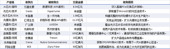 本輪增長紅利已惠及全產(chǎn)業(yè)鏈。報告覆蓋的芯片商、設(shè)備商及光纖光纜商營收均預計實現(xiàn)兩位數(shù)同比增長。為搶占技術(shù)制高點,產(chǎn)業(yè)并購異?;钴S,如Credo收購Hyperlume獲取光互連技術(shù)、Ciena收購Nubis布局CPO等,表明巨頭正通過資本手段快速整合下一代核心技術(shù)。