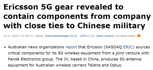 愛立信一直被視為中國5G設備供應商華為的安全替代品。華為被美國聯(lián)邦通信委員會FCC列為安全威脅。然而,據(jù)報道,華為與熊貓電子有密切的關系,而后者目前已被披露通過一家合資公司向愛立信供貨。