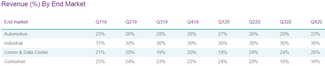 銷售收入為5.45億美元,跟上個季度的5.62億美元相比,環(huán)比下滑3%,跟去年同期的5.57億美元相比,同比下滑2%。分終端市場來看,Industrial占總銷售收入的36%,其次是Communications & Data Center的26%,Automotive的22%和Consumer的16%。該季度,Maxim來自這四大終端市場的銷售收入同比增幅分別為13%、36%、-22%和-30%。