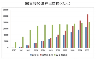 從產(chǎn)出結(jié)構(gòu)看,拉動產(chǎn)出增長的動力隨5G商用進(jìn)程的深化而相繼轉(zhuǎn)換。在5G商用初期,運營商大規(guī)模開展網(wǎng)絡(luò)建設(shè),5G網(wǎng)絡(luò)設(shè)備投資帶來的設(shè)備制造商收入將成為5G直接經(jīng)濟(jì)產(chǎn)出的主要來源,預(yù)計2020年,網(wǎng)絡(luò)設(shè)備和終端設(shè)備收入合計約4500億元,占直接經(jīng)濟(jì)總產(chǎn)出的94%。在5G商用中期,來自用戶和其他行業(yè)的終端設(shè)備支出和電信服務(wù)支出持續(xù)增長,預(yù)計到2025年,上述兩項支出分別為1.4萬億和0.7萬億元,占到直接經(jīng)濟(jì)總產(chǎn)出的64%。在5G商用中后期,互聯(lián)網(wǎng)企業(yè)與5G相關(guān)的信息服務(wù)收入增長顯著,成為直接產(chǎn)出的主要來源,預(yù)計2030年,互聯(lián)網(wǎng)信息服務(wù)收入達(dá)到2.6萬億元,占直接經(jīng)濟(jì)總產(chǎn)出的42%。