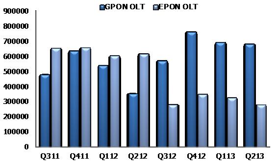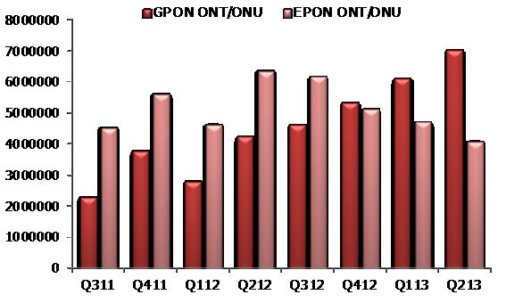 對于ODN市場來說有些問題需要注意,同樣對于處在ODN兩頭的PON市場的變化,也應引起重視。對于PON我們來看兩個圖表,關于目前全球PON市場的出貨量情況。