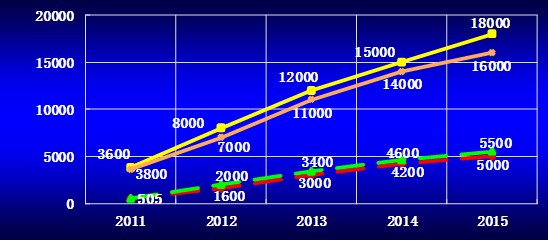從圖二發(fā)展趨勢可得出,中國FTTH的覆蓋數(shù)從2013年到2015年將增長45%-50%,而實際用戶數(shù)從2013年到2015年將增長60%-66%。如果按平均每戶3個人使用,則到2015年中國的FTTH覆蓋將達4.8-5.4億人;實際使用人數(shù)為1.5-1.65億人。