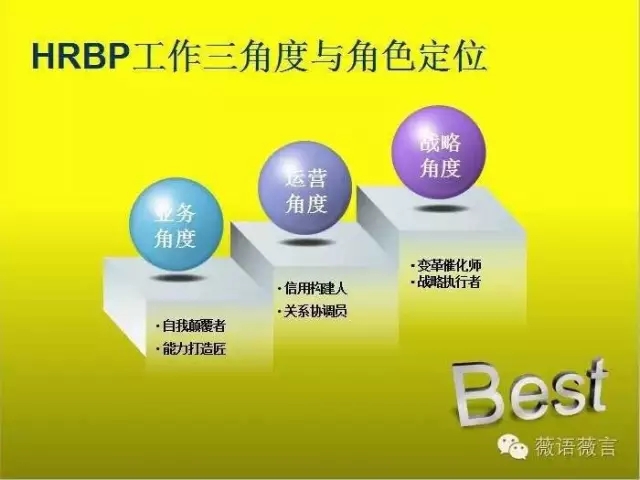 如果說過去我們傳統(tǒng)的HR是在事務(wù)行政運營層面來提供支持服務(wù)的,那么,HRBP區(qū)別于他們最主要的優(yōu)勢是HRBP作為業(yè)務(wù)合作伙伴其實是在業(yè)務(wù)角度、運營角度、戰(zhàn)略角度,這三個角度全面來支持業(yè)務(wù)發(fā)揮作用的。這三個角度的工作相互統(tǒng)一、層層遞進、環(huán)環(huán)相扣才使得HRBP的工作卓有成效。
