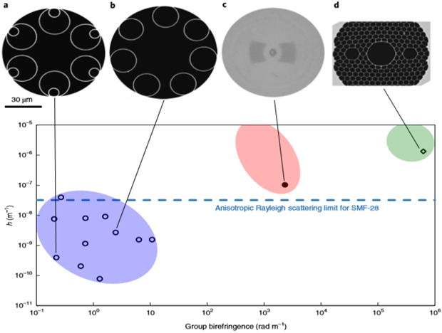 標(biāo)準(zhǔn)單模光纖(SSMF)在沒有受到外界擾動時,其偏振純度可以接近玻璃材料的各向瑞利散射特性所規(guī)定的極限值,例如SMF-28光纖在1550nm處其偏振耦合為3x10-8/m。然而當(dāng)受外界環(huán)境擾動時,會受到強烈的偏振模耦合,從而影響器件的性能。通過引入大的雙折射,保偏光纖可以破壞偏振模式耦合的相位條件,在外界的擾動下也能保持一個10-7至10-5/m的偏振耦合強度。然而,這些微弱的偏振耦合仍會給光纖系統(tǒng)帶來各種有害的影響,如熱相位噪聲,瑞利散射等隨機效應(yīng)和光克爾效應(yīng)、受激布里淵散射等非線性效應(yīng),限制了傳感器的注入光功率和信噪比。