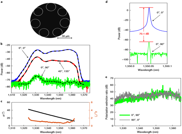 圖2a中反諧振空芯光纖用于導(dǎo)光的空氣纖芯直徑為42μm,七根非接觸式包層毛細(xì)管直徑為21μm,包層毛細(xì)管厚度為358nm。圖2d中測量到的偏振消光比70dB,對應(yīng)偏振耦合強度為3x10-9/m。