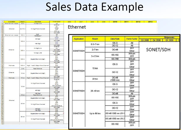 收發(fā)模塊的超過100多個產(chǎn)品類別從Q1'10到Q2'11期間的銷售數(shù)據(jù)(EXCEL表格數(shù)據(jù),請參考Sales data example)。該報告還提供對2011年剩余時間的市場預測。報告中的數(shù)據(jù)來自超過25家領先模塊和器件制造商。