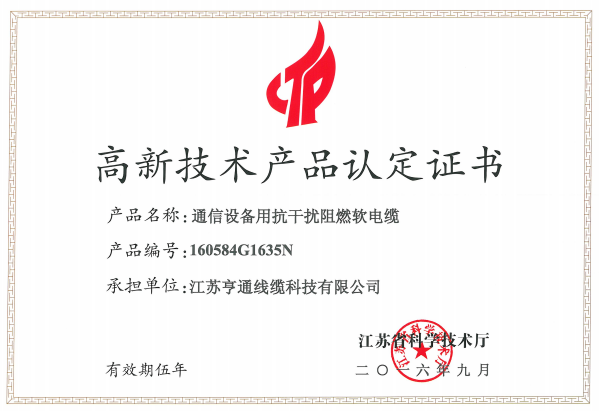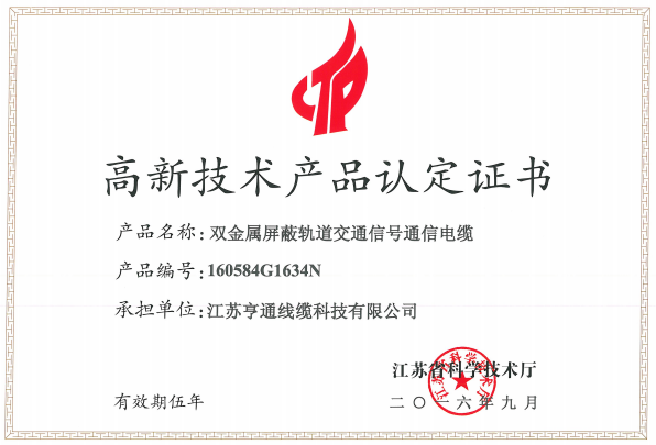 亨通線纜)的三項新品“通信設備用抗干擾阻燃軟電纜” 、“鎧裝屏蔽型抗干擾數(shù)據(jù)電纜”、“雙金屬屏蔽軌道交通信號通信電纜”,成功通過江蘇省高新技術產(chǎn)品認證,獲得高新技術產(chǎn)品認證證書。
