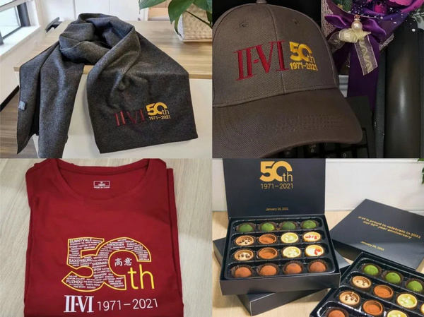 II-VI全體員工穿上慶典T恤、帽子或圍巾一起歡慶II-VI創(chuàng)立50周年。II-VI 亞太區(qū)總部向中國(guó)區(qū)寄出50周年定制版巧克力,共享此喜悅!