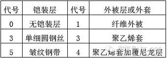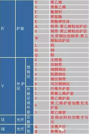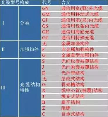 光纜的型式由五個(gè)部分組成,如下所示。各部分均用代號表示。