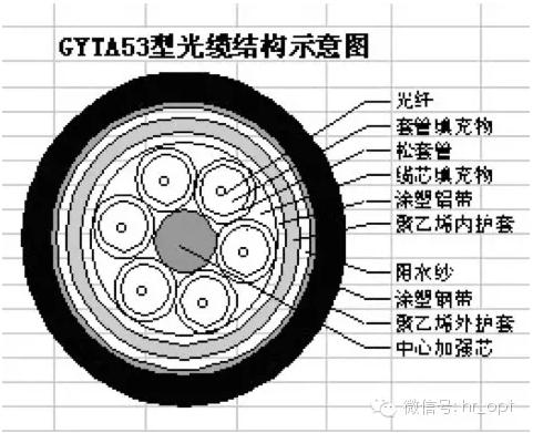 GYTA53(金屬加強(qiáng)構(gòu)件、松套層絞填充式、鋁-聚乙烯粘結(jié)護(hù)套、縱包皺紋鋼帶鎧裝、聚乙烯套通信用室外光纜)光纜的結(jié)構(gòu)是將單?;蚨嗄9饫w套入由高模量的塑料做成的內(nèi)填充防水化合物松套管中。纜芯的中心是一根金屬加強(qiáng)芯,對于某些芯數(shù)的光纜來說,金屬加強(qiáng)芯外還擠包一層聚乙烯(PE)。松套管(和填充繩)圍繞中心加強(qiáng)芯絞合成緊湊和圓形的纜芯,纜芯內(nèi)的縫隙充以阻水化合物。涂塑鋁帶縱包后擠一層聚乙烯內(nèi)護(hù)套,雙面涂塑鋼帶縱包后擠制成聚乙烯外護(hù)套成纜。