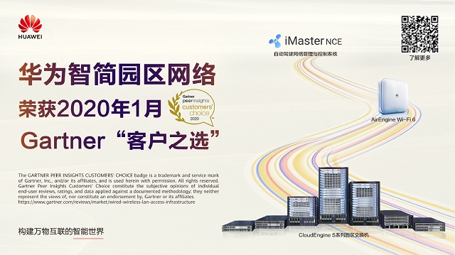 獲獎海報:華為園區(qū)網(wǎng)絡(luò)榮獲2020年1月Gartner Peer Insights有線與無線局域網(wǎng)絡(luò)基礎(chǔ)架構(gòu)“客戶之選”榮譽稱號