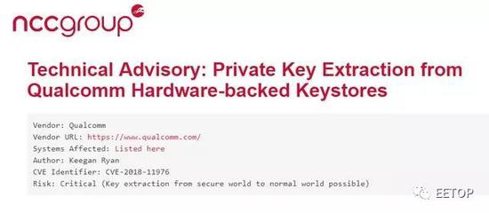 此一編號(hào)為CVE-2018-11976的漏洞,涉及高通芯片安全執(zhí)行環(huán)境(Qualcomm Secure Execution Environment,QSEE)的橢圓曲線數(shù)碼簽章算法(Elliptic Curve Digital Signature Algorithm,ECDSA),將允許黑客推測(cè)出存放在QSEE中、以ECDSA加密的224位與256位的金鑰。