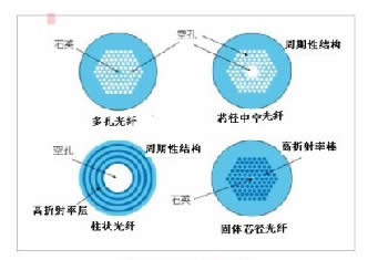 光子晶體光纖,具有在石英玻璃中(包層)有空孔的配列構(gòu)造。隨著PCF的空孔陣列結(jié)構(gòu)和空孔尺寸大小的變化,將呈現(xiàn)出與通常光纖不同的特點,即表現(xiàn)在高非線性、色散可控性、極化波保持和單模工作等各方面上。如果將PCF光纖光波傳輸原理進行分類,可以分為折射率波導型PCF光纖和光子帶隙光纖兩種。