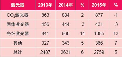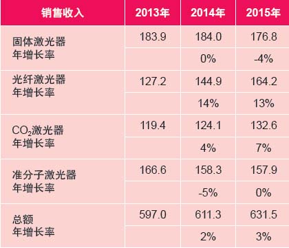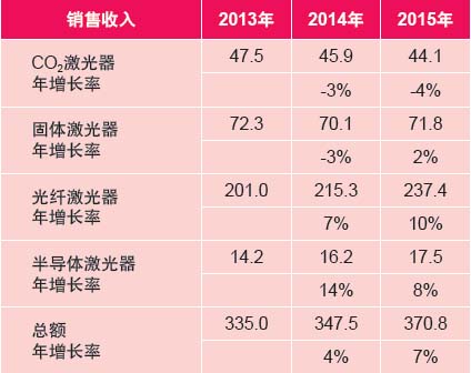 表1:工業(yè)激光器的銷售收入(貨幣單位:百萬美元)
