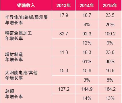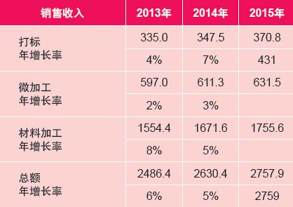 表4將微加工分為三個(gè)大的分類以及雜項(xiàng),從表中我們能看到半導(dǎo)體工業(yè)(一個(gè)典型的周期性行業(yè))的設(shè)備訂單下滑帶來的影響。再加上精密金屬加工這個(gè)主要行業(yè)的不確定性,導(dǎo)致2014年的銷售收入下降了2%。不過積極的一面是,3D打印技術(shù)煥發(fā)出極大的活力,引起了持續(xù)而廣泛的關(guān)注。這提高了眾多工業(yè)對(duì)增材制造(用高功率激光直接金屬沉積技術(shù)來制造零部件)的接受度。最終在這一領(lǐng)域的激光器銷售收入增加了34%,并且在2015年還會(huì)有更大的增長潛力,預(yù)期增長率將達(dá)到62%。
