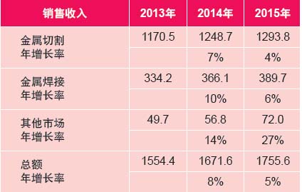 從表6來看,2014年材料加工領(lǐng)域的銷售收入有75%來自于金屬激光切割,主要是金屬板材切割。綜合來看,這一領(lǐng)域的銷售收入幾乎占據(jù)了所有工業(yè)激光器銷售收入的50%,從這個(gè)意義上來說,高功率激光器充滿著商機(jī),至少從銷售數(shù)字來看是這樣。激光焊接方面的銷售收入在2014年增加了10%,它在所有工業(yè)激光器的銷售總額中占據(jù)了14%的份額。
