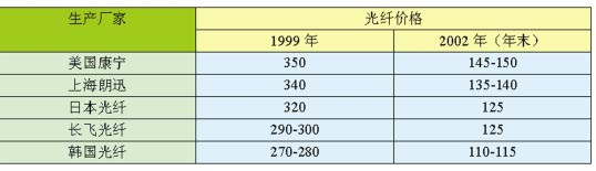 以1999年為例,當(dāng)時(shí)康寧光纖的售價(jià)在每公里350元左右,比國(guó)產(chǎn)長(zhǎng)飛光纖每公里要高出50-60元,而韓國(guó)光纖售價(jià)比長(zhǎng)飛要低20元左右。到2002年后半年,光纖的絕對(duì)價(jià)格都大大降低了。但相對(duì)價(jià)位順序基本未變。如下表四