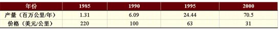 表三:1985-2000年世界單模常規(guī)光纖產(chǎn)量的價(jià)格變化