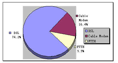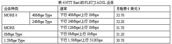 說明:1)月租費是從日元換算而來。2)ADSL業(yè)務(wù)分為兩種,一種是與電話業(yè)務(wù)共用銅線的ADSL業(yè)務(wù),如表中所列;另一種是專用的ADSL業(yè)務(wù),這種業(yè)務(wù)的資費要貴一點。3)電話加裝ADSL的初裝費為9.96美元。