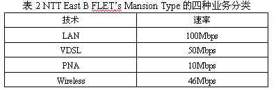日本的FTTB業(yè)務(wù)通常根據(jù)ONU到用戶家庭這一段采用的技術(shù)的不同而分為若干類,以NTT East的B FLET’S Mansion Type業(yè)務(wù)為例[8],它包括四種不同的業(yè)務(wù)類型。由于采用技術(shù)不同,ONU到用戶家庭之間的傳輸速率也不同,詳見表2。