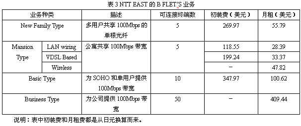 與美國不同,日本的FTTH通常只提供數(shù)據(jù)業(yè)務(wù),廣播視頻業(yè)務(wù)是被禁止提供的。日本的FTTH商業(yè)模式也不同,通常運營商只提供高速的接入服務(wù),而向第三方的內(nèi)容提供商開放接口,并向他們收費,這樣運營商就可以集中精力來做自己專長的事情。這樣的商業(yè)模式被稱為“批發(fā)”商業(yè)模式,運營商只管提供帶寬,收入來自于高速接入,而非內(nèi)容[3]。 日本的運營商為各種不同的用戶量身定制了各種不同的業(yè)務(wù)類型。NTT East的光纖接入業(yè)務(wù)叫B FLET’S,見于表3。為了與光纖接入的主要競爭對手ADSL做對比,表4列出了NTT East的ADSL業(yè)務(wù)FLET’S ADSL。